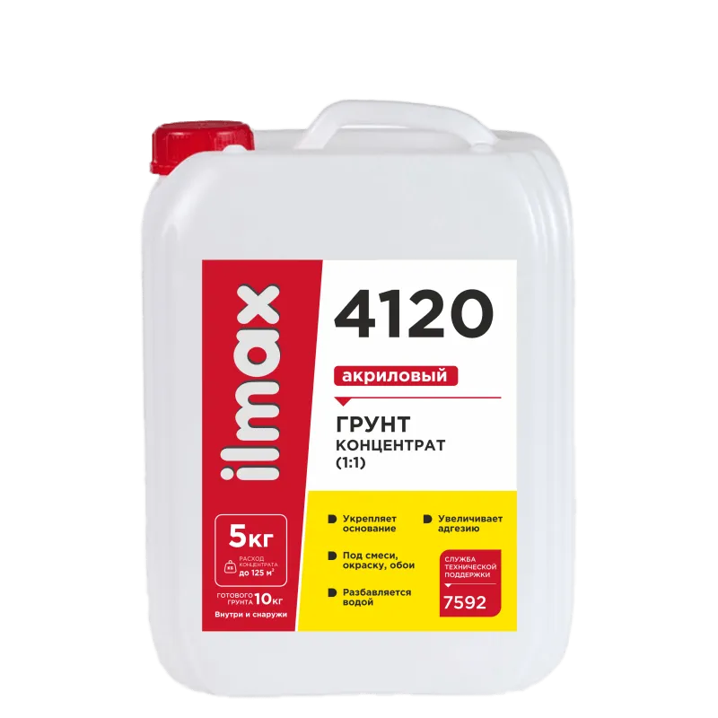 ilmax 4120 – грунт-концентрат (1:1) на основе дисперсии акрилового сополимера проникает в основание, обеспыливая и упрочняя его. После обработки поверхности грунтом снижается водопоглощение, тем самым предотвращается быстрое высыхание наносимых в дальнейшем материалов и обеспечивается их равномерный набор прочности. Обработка грунтом увеличивает адгезию между основанием и наносимыми материалами. После высыхания – прозрачный.