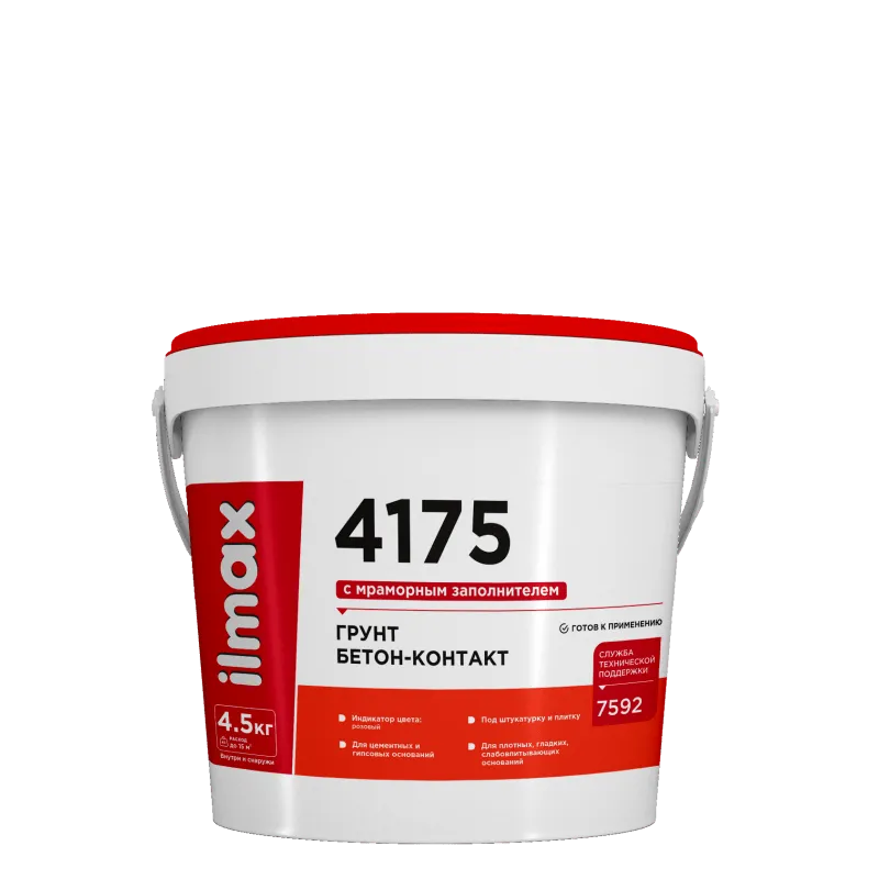 ilmax 4175 бетон-контакт – грунт розового цвета на основе дисперсии акрилового сополимера с калиброванным заполнителем из мрамора, обеспечивающий высокоадгезионный контактный слой. Индикатор цвета позволяет равномерно и без пробелов нанести грунт, тем самым обеспечив высокое качество подготовки основания. Бетон-контакт образует прочную шероховатую полимерную плёнку для гарантированного сцепления последующих слоёв с основанием.