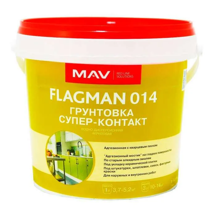 Грунтовка с кварцевым песком FLAGMAN 014 применяется для создания промежуточного адгезионного (сцепляющего) слоя перед нанесением следующих материалов: штукатурок и шпатлевок (гипсовых, цементно-известковых и цементных), армирующих и клеящих составов (в том числе для укладки керамической плитки), структурных штукатурок, водно-дисперсионных красок (фактурных и гладких, в т.ч. модифицированных силиконом). Грунтовка FLAGMAN 014ригодна для грунтования минеральных поверхностей плотной, гладкой структуры: бетонных, оштукатуренных, кирпичных, гипсокартонных. Может использоваться в системах утепления зданий и сооружений. Рекомендуется для нанесения на поверхности по старым прочно держащимся покрытиям, выполненным масляными или алкидными эмалями, дисперсионными или минеральными штукатурками, акриловыми красками. содержит кварцевый песок мелкой фракции, придающий загрунтованной поверхности шероховатость, благодаря чему грунтовка значительно повышает адгезию декоративных покрытий к основанию, белая, создает матовую шероховатую поверхность, улучшает сцепление с основанием последующих материалов, позволяет снизить затраты, связанные с подготовкой поверхности, ранее окрашенной старыми алкидными и масляными эмалями и красками.