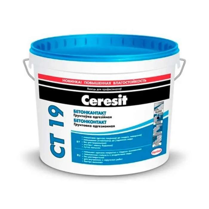 Грунтовка Ceresit CT 19 предназначена для обработки гладких, плотных, впитывающих и невпитывающих оснований перед нанесением ремонтных штукатурок, шпатлевок и клеевых смесей внутри и снаружи зданий. Может наноситься на бетонные основания (в т.ч. вакуумированный бетон), мозаичные полы, известковые, цементно-известковые и цементные штукатурки и стяжки, малярные покрытия (прочные, с высокой адгезией), каменные и керамические плитки, поверхности с остатками трудноудаляемых клеев. Также Ceresit CT 19 можно наносить на гипсокартонные плиты, ДСП и OSB. В состав грунтовки входит кварцевый наполнитель, придающий шероховатость обработанной поверхности, благодаря чему обеспечивается высокая адгезия отделочных материалов к гладким основаниям. Грунтовка Ceresit CT 19 значительно уменьшает гигроскопичность загрунтованного основания, что предотвращает чрезмерно быстрое пересыхание наносимых затем материалов. Для поверхностного укрепления и пропитки пористых, сильновпитывающих оснований следует применять Ceresit CT 17.