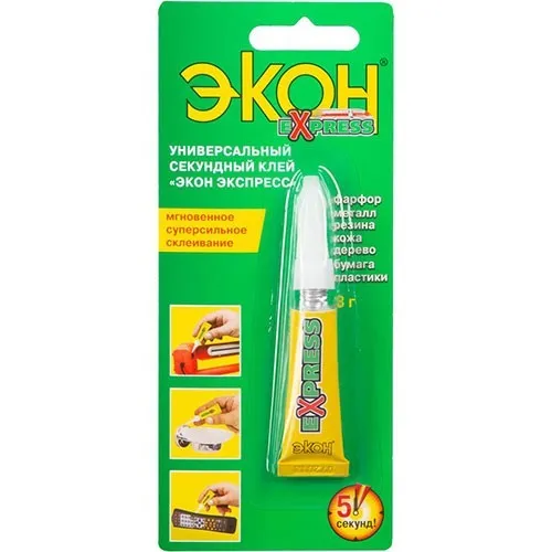 Клей ЭКОН ЭКСПРЕСС секундный обеспечивает быстрое и прочное склеивание. Идеален для мелкого бытового ремонта. Заполняет мелкие трещины.
