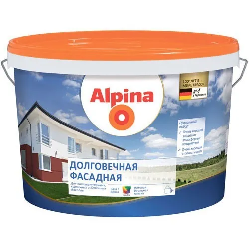 Стойкие фасады продлевают срок службы Вашего дома. Alpina Долговечная фасадная - это оптимальное решение для долговременной защиты Вашего дома от ветра и погодных воздействий. Эту матовую и грязеотталкивающую дисперсионную краску можно легко использовать почти на всех основаниях. Заодно при покраске будут выравнены небольшие неровности штукатурки. Кроме того, краска Alpina Долговечная фасадная водоотталкивающая и предотвращат тем самым проникновение влаги в стены, будь то штукатурка, кирпич или бетон. Вы можите оформить Ваш дом согласно любым цветовым представлениям, не отказываясь при этом от ярких акцентов. Alpina Долговечная фасадная поможет Вам в этом, предоставив большое разнообразие оттенков. Свойства продукта: очень хорошая защита от атмосферных воздействий; очень хорошая стойкость цвета.
