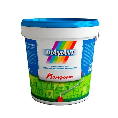 Краска акриловая Diamant Комфорт водно-дисперсионная белая предназначена для декоративной отделки стен и потолков, не подвергающимся высоким нагрузкам. Применяется только внутри помещений.