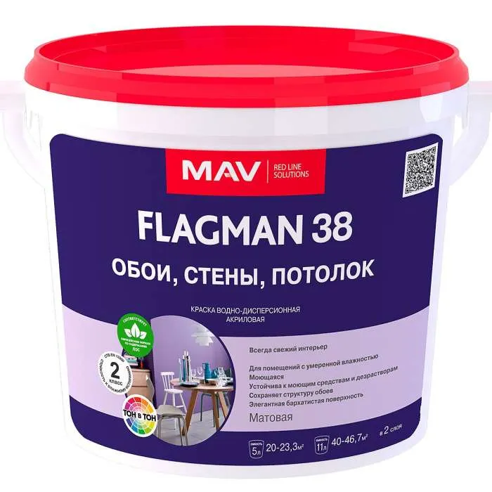 Применяется для окраски стен и потолков в помещениях с умеренной влажностью (спальни, гостиные, кухни, детские, коридоры, кабинеты, студии, салоны). Рекомендуется для помещений с повышенными требованиями к эксплуатации и санитарно-гигиеническому состоянию в учебных, медицинских учреждениях, нуждающихся в систематической влажной уборке. Для окраски минеральных поверхностей (бетон, штукатурка, кирпич, гипсокартон). Подходит для гладких, тисненых и рельефных бумажных, виниловых, флизелиновых, стекловолокнистых и других обоев под покраску. Свойства моющейся интерьерной краски FLAGMAN 38 обои, стены, потолок: образует гладкое, ровное, матовое покрытие, водно-дисперсионная акриловая – без резкого запаха растворителя. Расход — 300-350 г/м2 на 2 слоя. Обладает превосходными малярными характеристиками: легко наносится, не разбрызгивается, хорошо укрывает, имеет прочное сцепление с окрашиваемой поверхностью. Характеризуется отличными эксплуатационными свойствами: относится ко 2-му классу стойкости к влажному истиранию в соответствии с СТБ EN 13300: краска моющаяся, окрашенное покрытие периодически можно мыть с применением неабразивных моющих средств и дезрастворов. Покрытие не стимулирует рост и развитие микрофлоры – покрытие не является питательной средой для размножения бактерий. Соответствует европейским требованиям по допустимому содержанию летучих органических соединений (ЛОС) согласно директиве 2004/42/ЕС: краска экологически безопасна для здоровья человека при нанесении и во время эксплуатации покрытия. 11 л краски покрывает 40-46,7 м2 в 2 слоя.