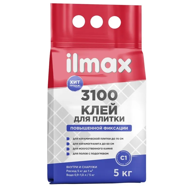 ilmax 3100 предназначен для приклеивания облицовочных материалов: керамической плитки (сторона до 70 см) и керамогранита (сторона до 60 см); плит из натурального и искусственного камня, не склонного к прокрашиванию и устойчивого к влажности; цементной, клинкерной и бетонной плитки.