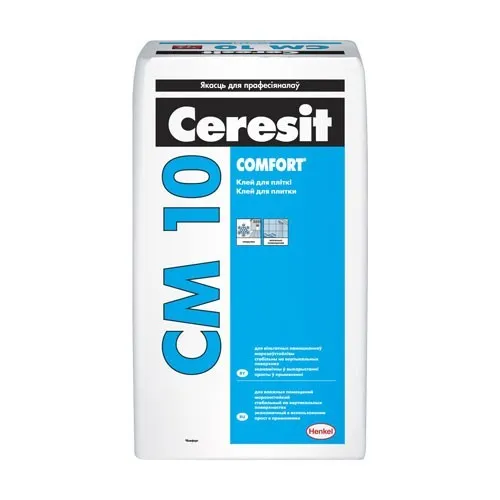 Клеящая смесь Ceresit CM 10 предназначена для приклеивания керамических (глазурь и терракота) и цементных плиток размером до 40х40 см и водопоглощением более 1% на недеформирующихся поверхностях, таких, как бетон, цементная стяжка, цементная и цементно-известковая штукатурки. Может применяться для кладки стен из газосиликатных и пенобетонных блоков. Клеящая смесь Ceresit CM 10 может применяться как внутри, так и снаружи зданий. В случае деформирующихся оснований, таких, как гипсокартонные плиты и плиты OSB необходимо использовать Ceresit CM 16; для обогреваемых полов и по подплиточной гидроизоляции (продукты группы CL, CR) – Ceresit CM 14, СМ 16. При укладке плитки с водопоглощением менее 1% (например, грес) необходимо применять Ceresit CM 11 Plus, CM 12, CM 14, CM 16. Плитки из мрамора и других светлых крупнокристаллических пород, склонных к изменению цвета, необходимо укладывать с помощью Ceresit CM 115, CM 74, CE 79.
